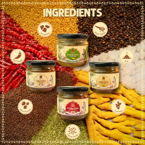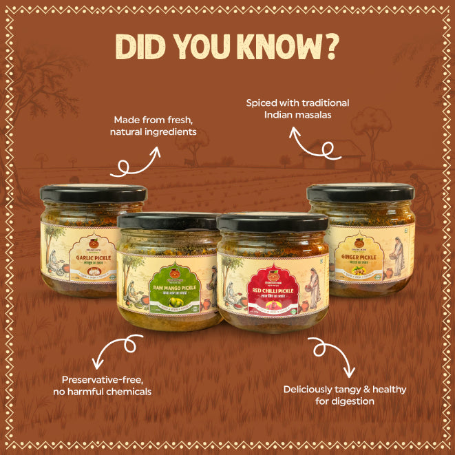 A perfect combo of Bundelkhand’s favourite pickles – tangy mango, spicy red chilli, bold garlic, and zesty ginger – all in one pack.