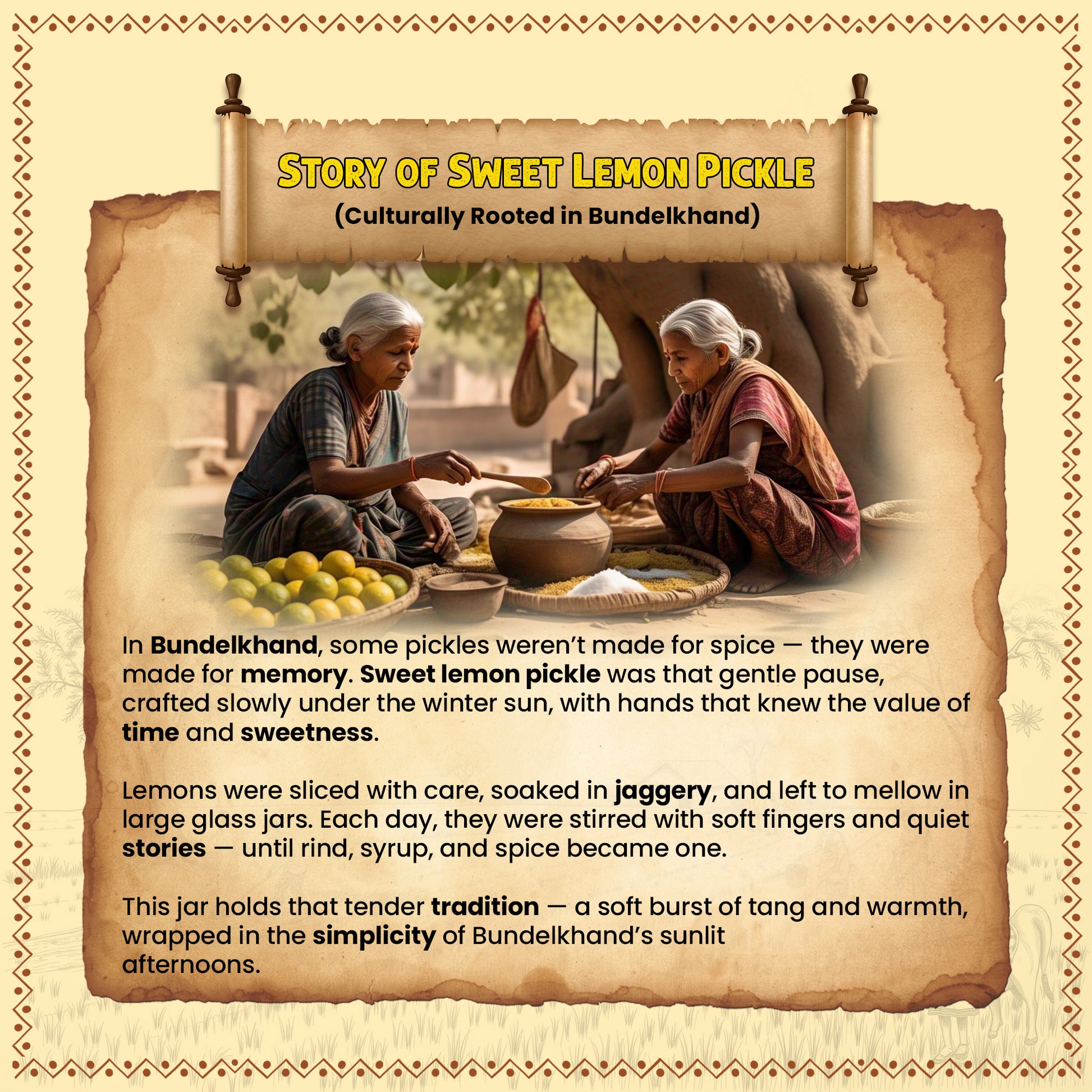 This Sweet Lemon Pickle is a timeless delicacy made by slowly aging lemons with jaggery and delicate spices. It’s both a digestive and a flavorful side that complements heavy meals or can be eaten solo. A jar full of sunshine and sweet zest!